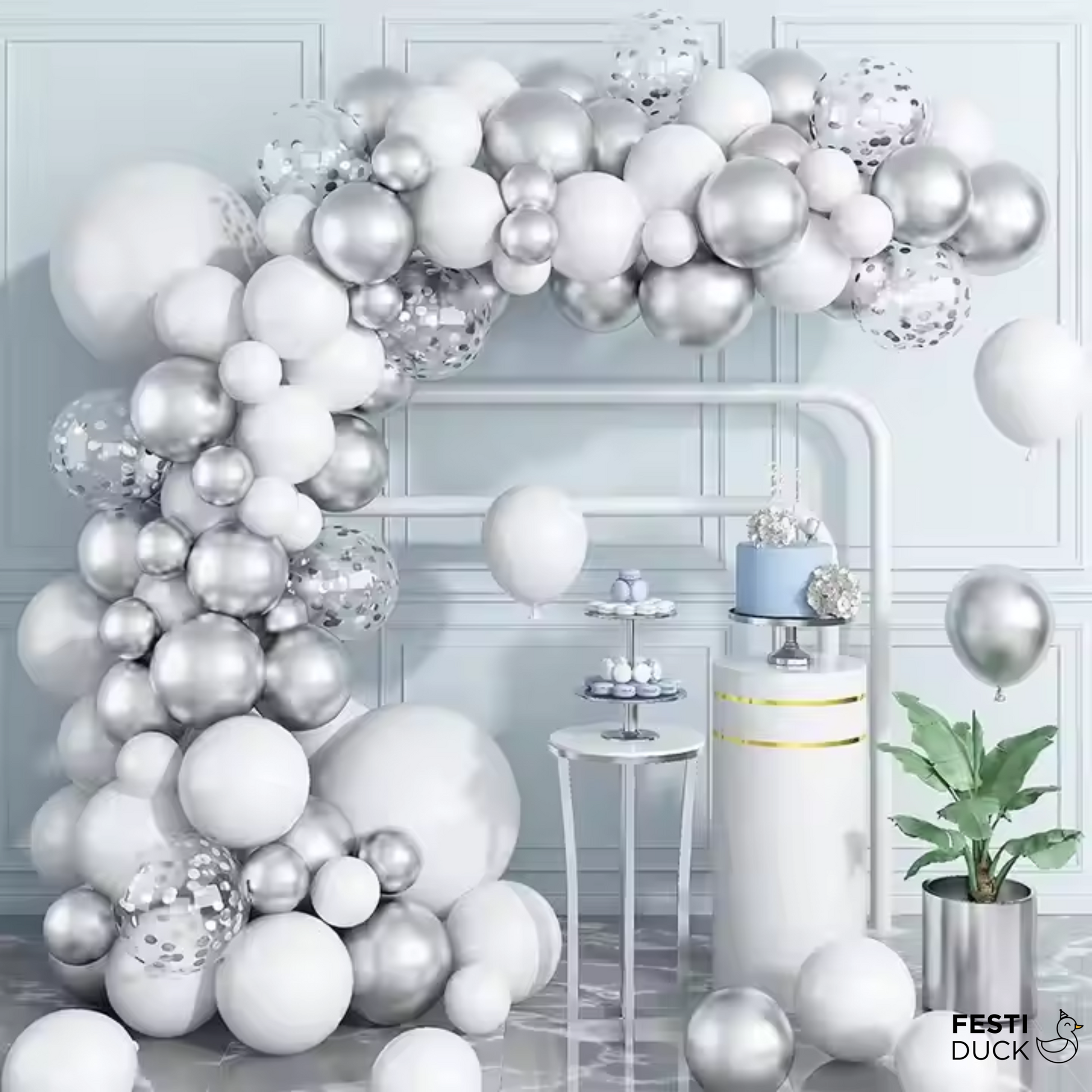 Festi Duck Birthday Balloon Combo Set (80 Pcs) – Silver Chrome, White & Silver Confetti Balloons, Happy Birthday Silver Banner, Balloon Arch & Glue Dot