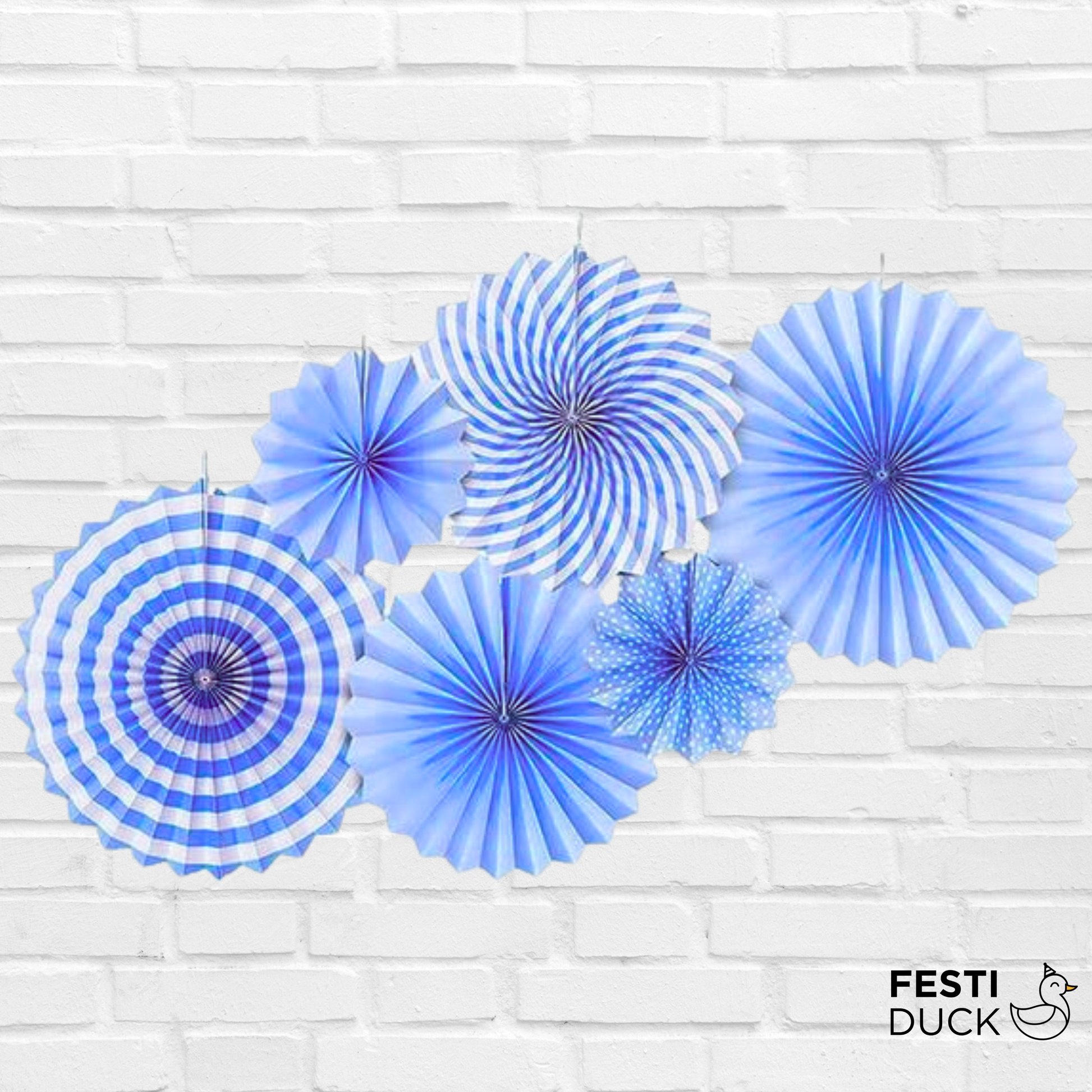 3. Elegant Paper Fans: 6 thickened blue fans in versatile sizes (16", 12", and 8") for depth and charm.