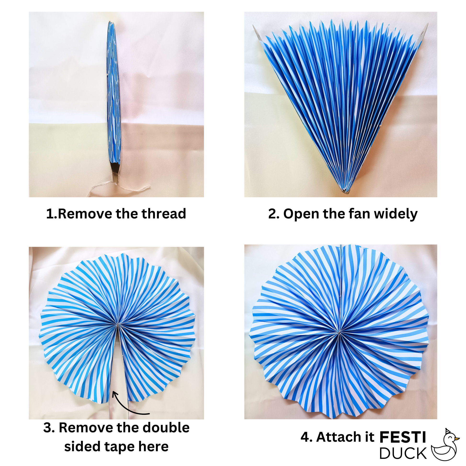 The blue paper fans, crafted from thickened, high-quality paper, bring sophistication and depth to your decorations. They’re versatile, reusable, and designed to be a centerpiece of your party decor. The combination of blue and metallic white balloons enhances the overall aesthetic, creating a striking contrast that draws attention.